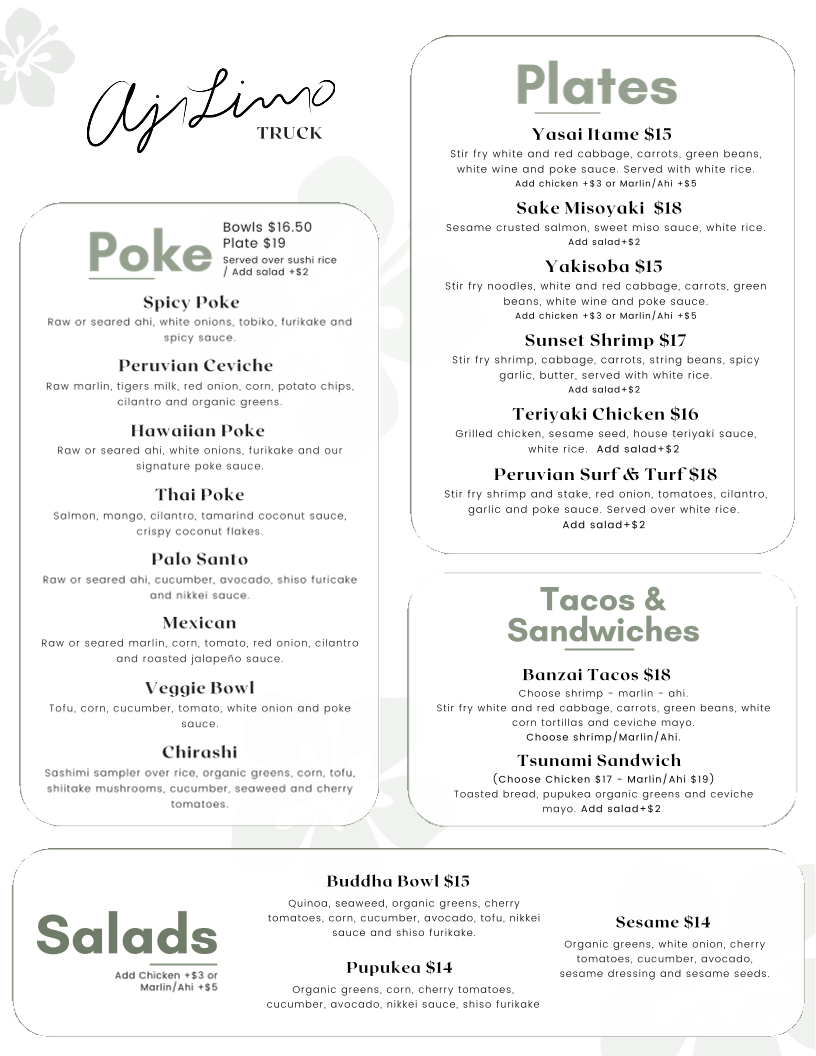 Welcome to Aji Limo Truck, a vibrant culinary gem located at 57-512 Kamehameha Hwy, Haleiwa, HI. This delightful food truck offers a diverse menu that celebrates flavorful dishes inspired by both Hawaiian and Peruvian cuisines.